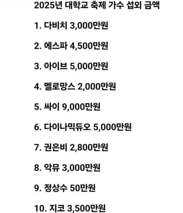 2025년 대학교 축제 가수 섭외 금액