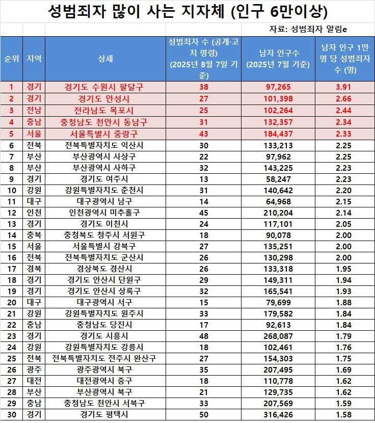 성범죄자 많이 사는 지자체 (인구 6만이상)