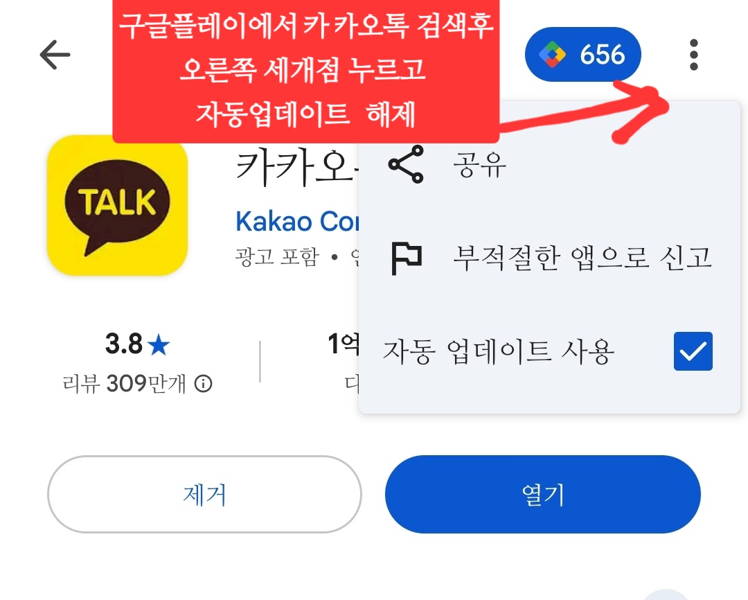 카카오톡 자동업데이트 끄기 . 구글플레이에서 카카오톡 검색후 오른쪽 점세개 누르고 자동업데이트 체크 해제